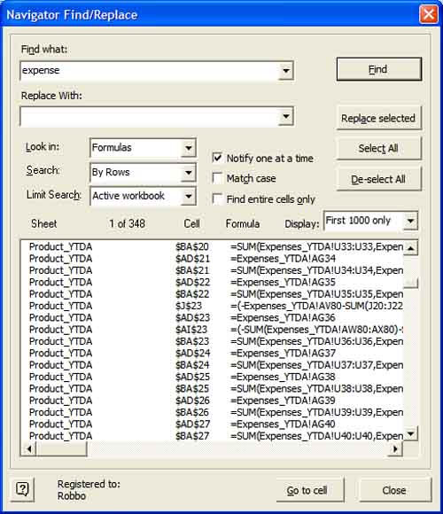 | Lists all finds in the active workbook, worksheet, range of cells, or even all open workbooks. |